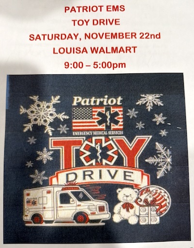 Patriot EMS will be doing our annual toy drive (Stuff the Ambulance Day) at the Louisa Walmart November 22nđ 9:00 – 5:00. All Items will be given to the needy families in Lawrence County for Christmas.