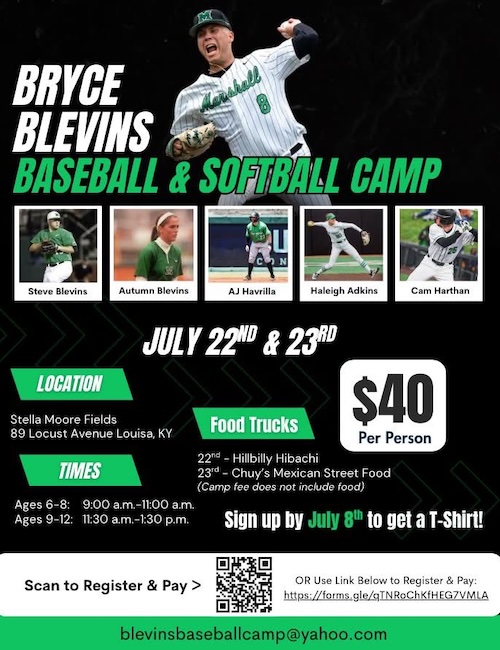 Louisa, Ky. —  For the second consecutive summer Former Bulldog and Marshall star pitcher Bryce Blevins will host a baseball and softball camp at Stella Moore Fields.