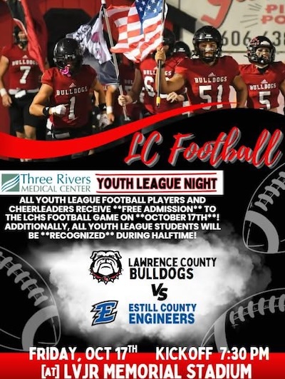 Louisa, Ky. — It will be Youth league night when the Lawrence County Bulldogs host the Estill County Engineers in a key District game on Friday night at Luke Varney Jr. Memorial Stadium.