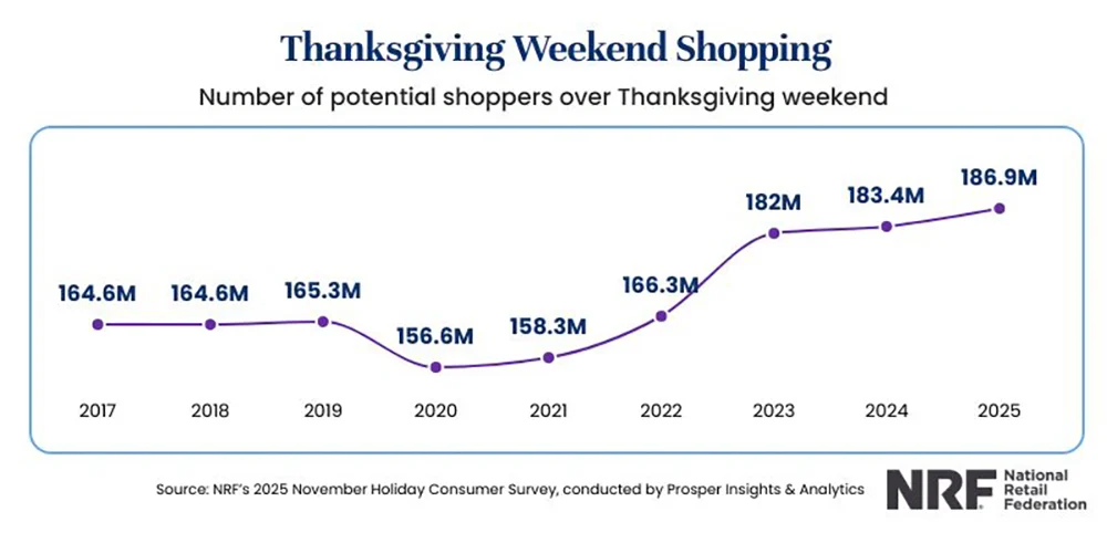 NRF also estimates that a record 186.9 million people plan to shop for deals from Thanksgiving Day through Cyber Monday in 2025 — approximately 3.5 million more total shoppers than the previous record of 183.4 million last year.