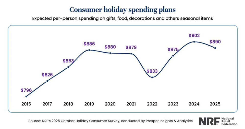 A previously released NRF survey revealed that consumers plan to spend an average of $890.49 per person on holiday gifts, decorations and other seasonal items this year — the second-highest amount on record, just 1.3% below last year’s all-time high of $901.99