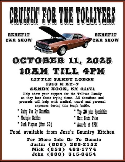 Announcements CRUISIN’ FOR THE TOLLIVERS Last updated: October 9, 2025 10:35 am Special For The Lazer Share SHARE Share This Article Facebook Twitter Copy Link Print Share Previous Article Traffic Advisory: Culvert Replacement on KY 3 in Boyd County, use Lawrence Co. detour Next Article BREAST CANCER AWARENESS: Have you had your annual mammogram? Stay ConnectedFacebookLikeTwitterFollowInstagramFollowYoutubeSubscribeLinkedInFollowLatest News Building Bridges: Lawrence Co. Homeschool teens visit with Legislators Education Lawrence County brings home Coach, Player and Lineman of the year for Class 3A District 8 Stay Ahead with Lazer Sports News ‘God’s bringing down walls’: Weeks-long revival sparks church remodel as hundreds flock to worship Lifestyles Martin Co. Schools teacher was drunk at her elementary school job, school police say Regional News Headlines: Daily News Briefing