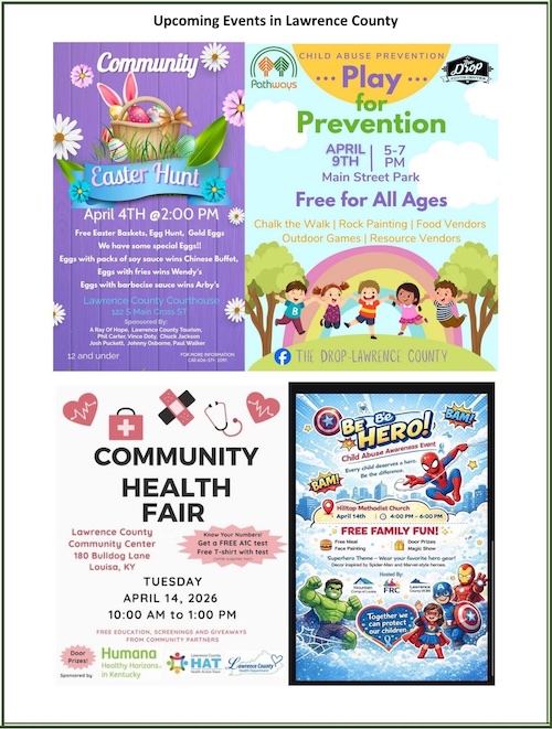 Announcements EVENTS ADDING UP FOR LAWRENCE CO. EASTER WEEK Last updated: April 3, 2026 10:29 am Special For The Lazer Share SHARE Share This Article Facebook Twitter Copy Link Print Share Previous Article LAWRENCE ANIMAL CONTROL SAYS EXPLOSION OF UNWANTED IS ‘THE WORST ITS EVER BEEN’ Next Article VOLUNTEERS MAKE BIG DIFFERENCE IN YATESVILLE CLEANUP Leave a Comment Leave a Reply Cancel replyYour email address will not be published. Required fields are marked *Comment * Name * Email * Website Save my name, email, and website in this browser for the next time I comment. Stay ConnectedFacebookLike0Follow0FollowYoutubeSubscribeLinkedInFollowLatest News Beshear calls Trump’s mail-in voting order ‘entirely unconstitutional’ Editorials/Letters VOLUNTEERS MAKE BIG DIFFERENCE IN YATESVILLE CLEANUP Lifestyles LAWRENCE ANIMAL CONTROL SAYS EXPLOSION OF UNWANTED IS ‘THE WORST ITS EVER BEEN’ Business/Politics Baseball Dawgs Start Western Kentucky Spring Break Trip 1-1 Stay Ahead with Lazer Sports News