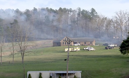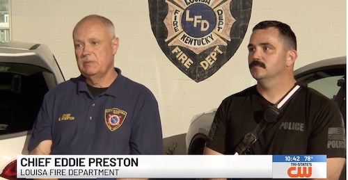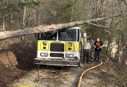 LOUISA, Ky. — A small brush fire spread though an area of Lawrence County as strong winds pushed it across a fireline and a road into an area containing two structures, one being a home. Firefighters were fighting the intense flames when a large oak tree fell across a large firetruck narrowing missing the operator on the scene.