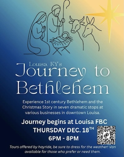 Local organizer Chris Jobe says stops on the journey will begin at Louisa First Baptist Church where participants will register much like Joseph and Mary were required to do by the tax collectors.