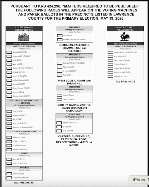 76 counties will have a contested Republican primary for judge/executive. on May 19, 2026. And Lawrence County is one of them. Currently we pay the experienced judge $110,000 for the salary which usually pays just over $80,000 for a newly elected one.