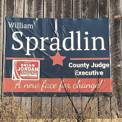 And on the facebook our four candidates for judge/executive are beginning to let it go! These signs are on the web and one on a billboard or two.