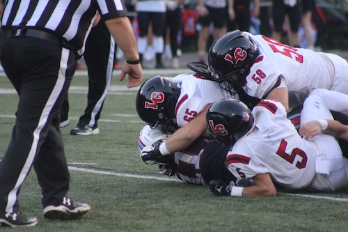 #65 Carson Fraley, #58 Aiden Patton and #5 Kaden Johnson smother Martin Co. QB Devin Maynard for a short gain.