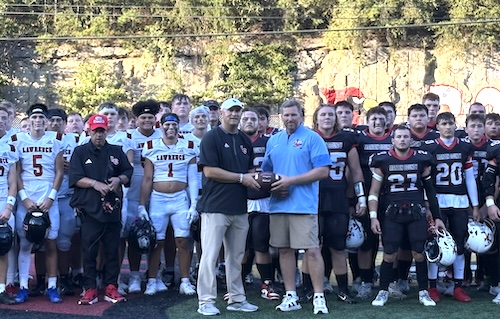 Lawrence Co. Head Coach Alan Short and Martin Co. Head Coach Josh Muncy with the special commemorative football honoring Phillip Haywood before the game. Only ten footballs were made and used around the state to honor the longtime Belfry head coach.
