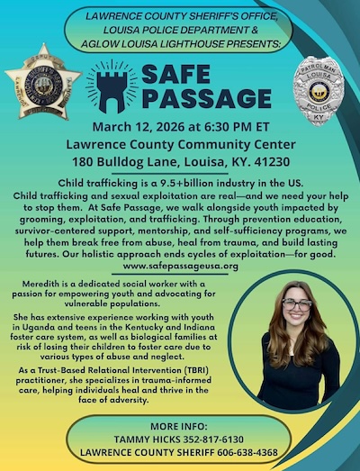 Lawrence County Sheriffs Office We’re happy to announce we are conducting another community workshop. The Lawrence County Sheriff’s Office along with the Louisa Police Department will be hosting this event. The event will be open to Law Enforcement, School Staff, Guidance Counselors, Mental Healthcare Providers, Social Workers, Youth League Coaches, FosterCare Providers, Church Youth Group Leaders and Civic Groups who Interact with the youth on a regular basis. Please Register at https://docs.google.com/forms/d/e/1FAIpQLSe7FjqRCNDxCeLdBB|5ef3gFr9b- LOOSIrXj3BUhSIQp5yDMw/viewform