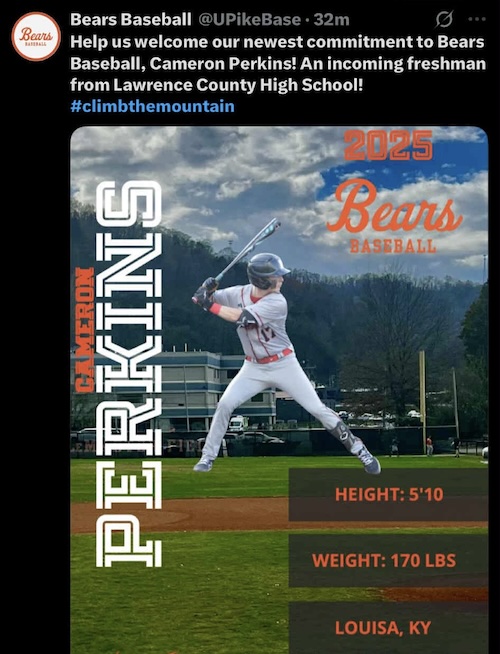 Louisa, Ky. — UPike picked up another Bulldog baseball standout recently as Cameron Perkins will continue is academic and athletic career this fall.