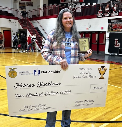 The Golden Owl Award is awarded to the state’s top agriculture teachers, with nominations collected from local students, parents, fellow teachers, and community members. Mrs. Blackburn was presented with a personalized plaque and received a $500 check from Ms. Sheldon McKinney, Executive Director of the KY FFA Foundation.