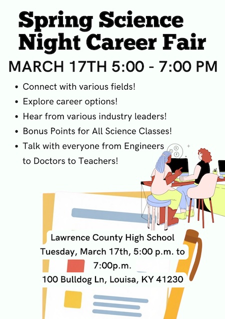 Announcements LCHS Spring Science Night Career Fair set for March 17 Last updated: February 16, 2026 12:58 pm Special For The Lazer Share SHARE Share This Article Facebook Twitter Copy Link Print Share Previous Article Tolsia Wins Two Out Of Three With Lone Loss Coming To #1 Gilmer County Next Article SEN. PHILLIP WHEELER’S LEGISLATIVE UPDATE: Week six of the 2026 Regular Session Leave a Comment Leave a Reply Cancel replyYour email address will not be published. Required fields are marked *Comment * Name * Email * Website Save my name, email, and website in this browser for the next time I comment. Stay ConnectedFacebookLikeTwitterFollowInstagramFollowYoutubeSubscribeLinkedInFollowLatest News Bad Bunny and The Super Bowl: Did it work for you? Editorials/Letters Mary Ann Pack, 71, of Louisa, KY Obituaries Online in Louisa Ft. Gay-Prichard W. Va SEN. PHILLIP WHEELER’S LEGISLATIVE UPDATE: Week six of the 2026 Regular Session Business/Politics Tolsia Wins Two Out Of Three With Lone Loss Coming To #1 Gilmer County Stay Ahead with Lazer Sports News