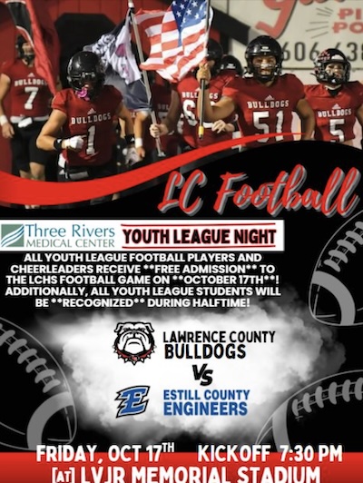 The LCHS Bulldogs play the Estill County Engineers on Friday, Oct 17th at LVJR Memorial Stadium with kickoff set for 7:30 PM! It’s also TRMC Youth League Night! So all youth league football players and cheerleaders will receive Free Admission into the game. They will also be recognized on the field during halftime! Come out and let’s support our LC Bulldogs! Photo Credit: Shela Bowens