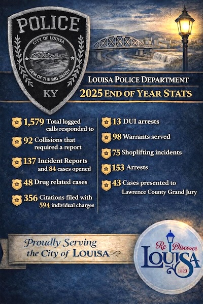 Courthouse LOUISA POLICE DEPT. RELEASES 2025 END OF YEAR STATISTICS Last updated: January 5, 2026 10:45 am Chief Steven Wilburn Share SHARE Share This Article Facebook Twitter Copy Link Print Share Previous Article James Owen Lambert, 73, of Ashland, KY, formerly of Louisa Next Article Rhonda Collins Selected As Lawrence County Health Department’s 2025 Employee Of The Year By Her Peers!! Leave a Comment Leave a Reply Cancel replyYour email address will not be published. Required fields are marked *Comment * Name * Email * Website Save my name, email, and website in this browser for the next time I comment. Stay ConnectedFacebookLikeTwitterFollowInstagramFollowYoutubeSubscribeLinkedInFollowLatest News Bonnie Fraley, 78, of Louisa, KY Obituaries Online in Louisa Ft. Gay-Prichard W. Va Lawrence County Fiscal Court Special Meeting Agenda January 9, 2026 Courthouse Tolsia Upended By Undefeated Man In Boys Basketball Action Stay Ahead with Lazer Sports News SEN. PHILLIP WHEELER PROVIDES DETAILS ON HOW TO RECEIVE LEGISLATIVE UPDATES, SHARE THOUGHTS WITH LAWMAKERS Editorials/Letters