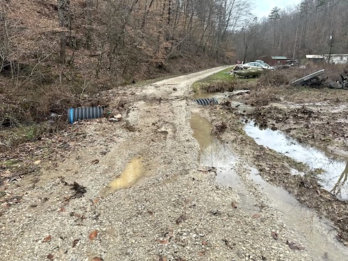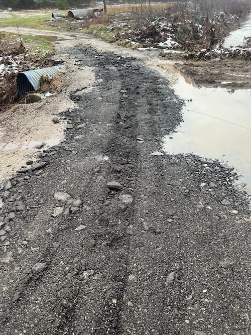 “… This is our road on Pigeon Roost in Martha, can’t get the county to work on it have called 3 times to try and get it fixed was told they was only working where the bus runs only but there is 5 kids on up from this that go to school and we are having to park our vehicles on the other side and walk home. If there was to be an emergency there is no way for the emergency personnel to get across @Travis Hughes