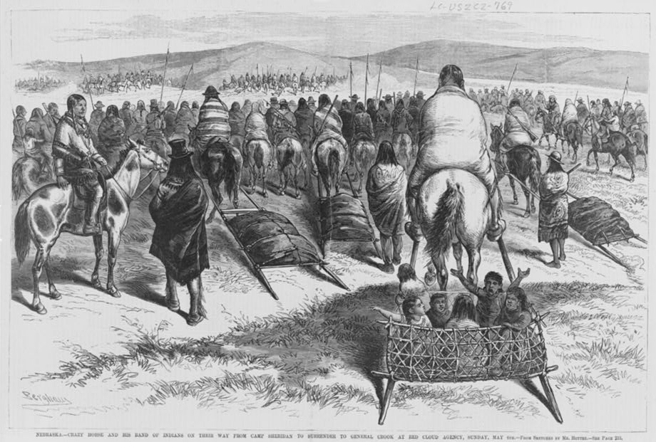 Crazy Horse and his band of Oglala on their way from Camp Sheridan to surrender to Gen. Crook at Red Cloud agency, on Sunday, May 6, 1877. (Public Domain) |