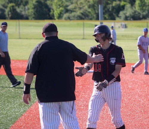 Tygar Cavins gets congratulated by first base coach Julius Music after another hit.